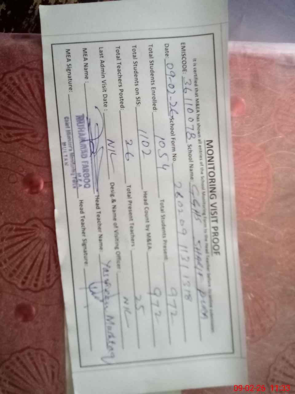 | EMIS Code: 36110078 | Name of School: GGHS SHARIF PURA MULTAN | |||