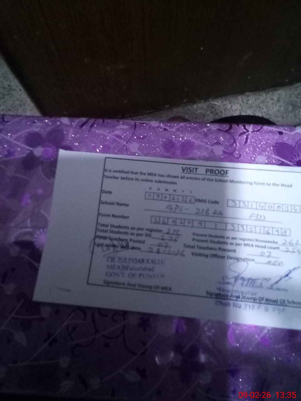 | Certified that this School was Inspected by the Undersigned MEA/DMO Today and the Information Stated Above is as Per Record. | |||||