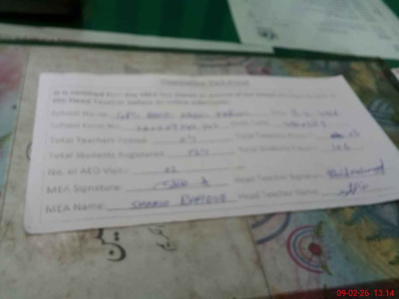 | Attendance Register | Head Teacher | MEA with School | Visit Proof |
