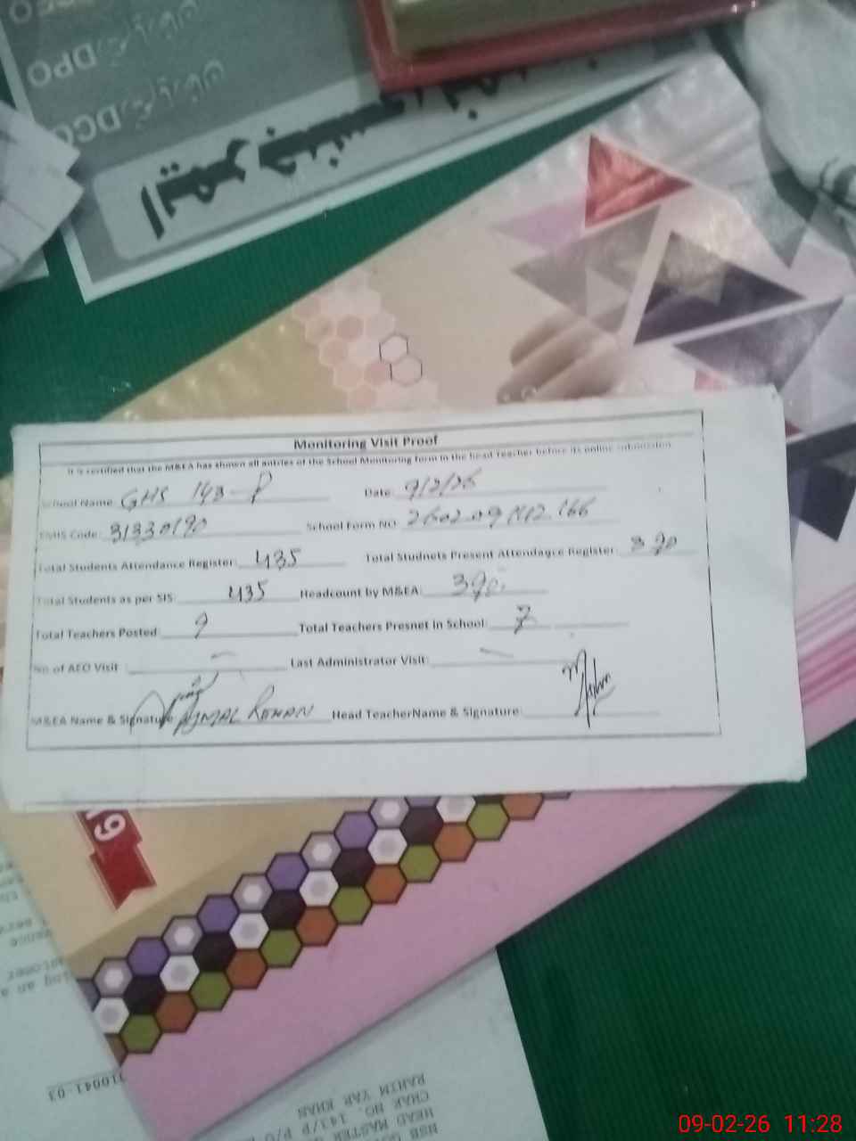 | Attendance Register | Head Teacher | MEA with School | Visit Proof |