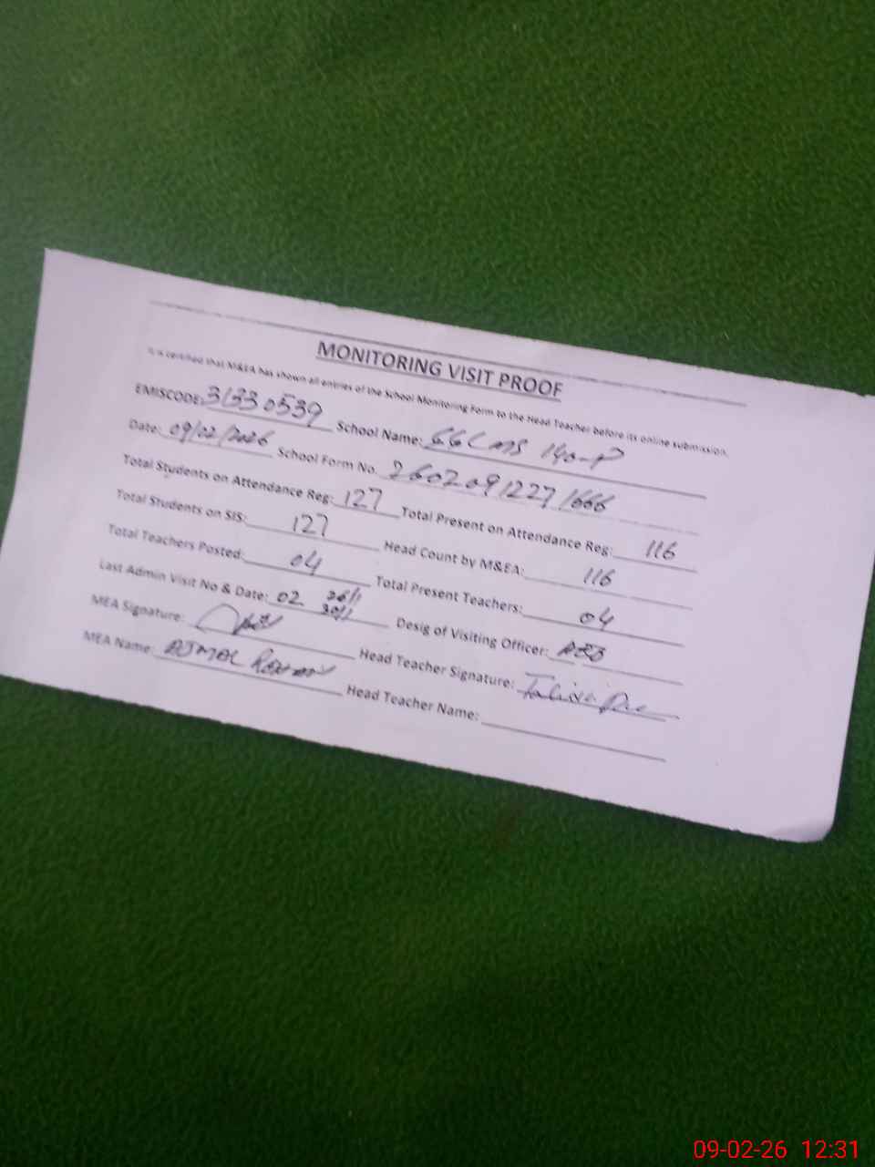 | Attendance Register | Head Teacher | MEA with School | Visit Proof |