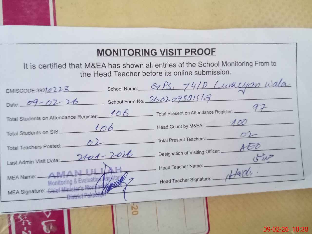 | Attendance Register | Head Teacher | MEA with School | Visit Proof |