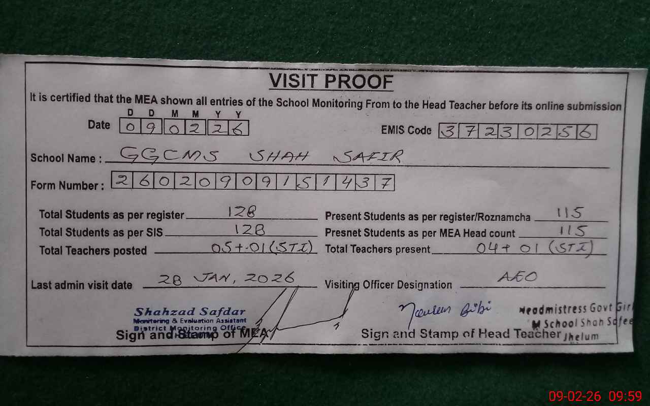 | EMIS Code: 37230256 | Name of School: GGCMS SHAH SAFIR | |||