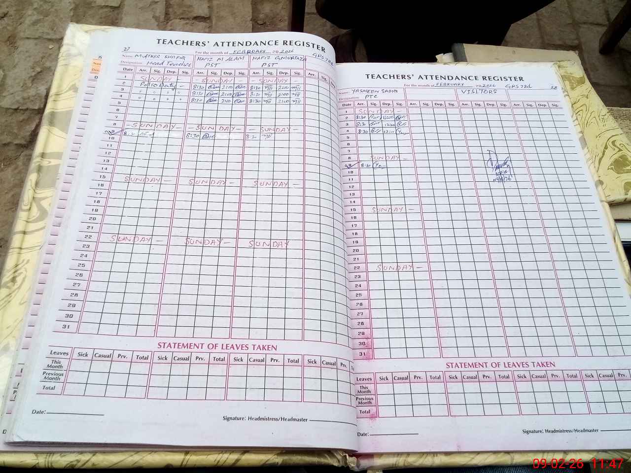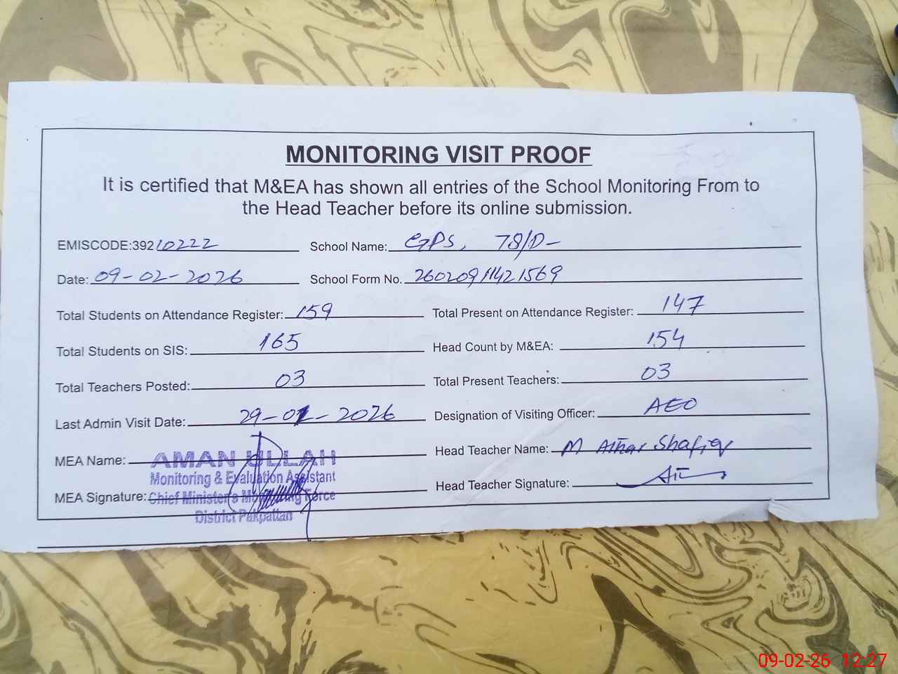 | Attendance Register | Head Teacher | MEA with School | Visit Proof |