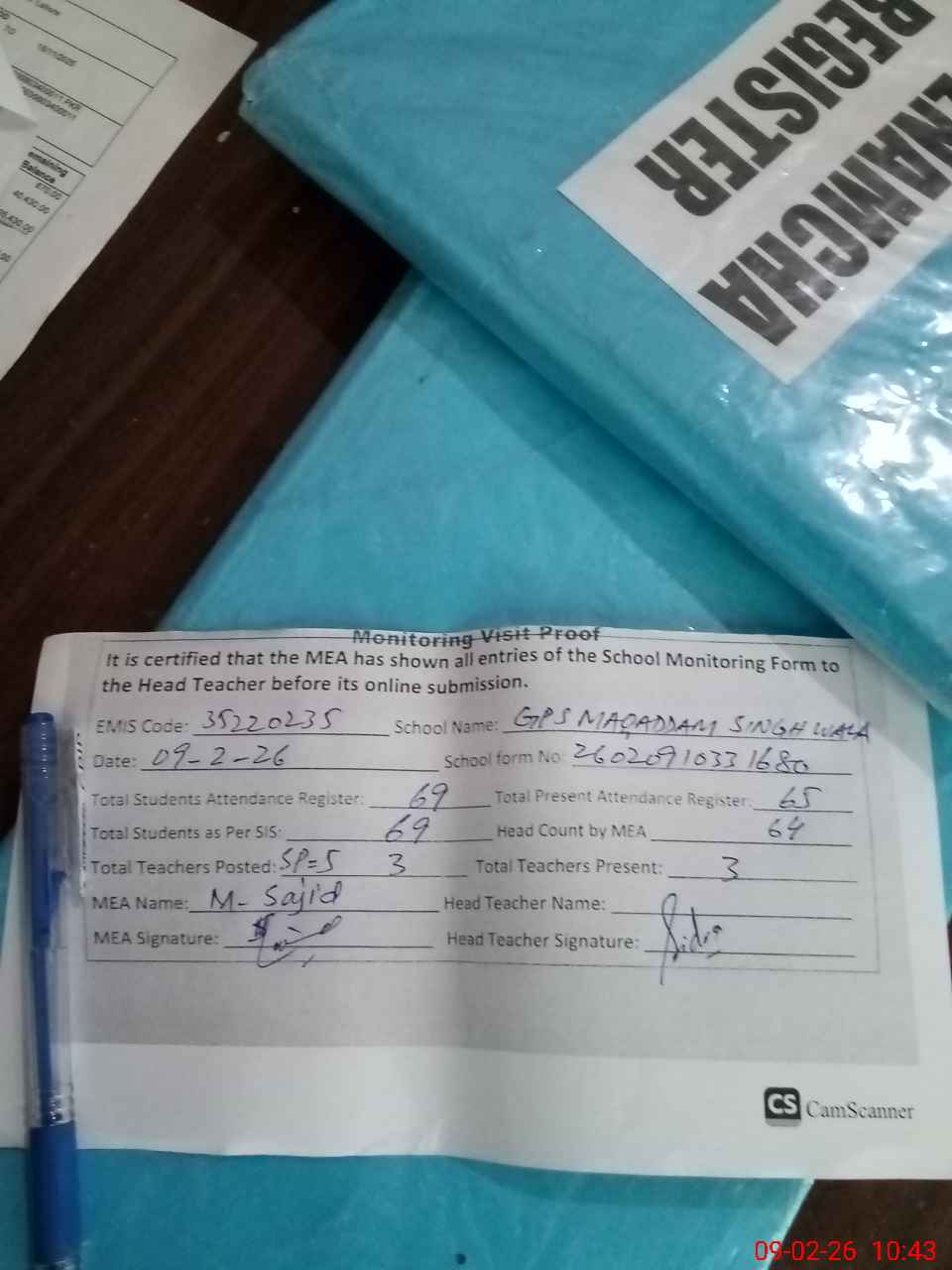 | Attendance Register | Head Teacher | MEA with School | Visit Proof |