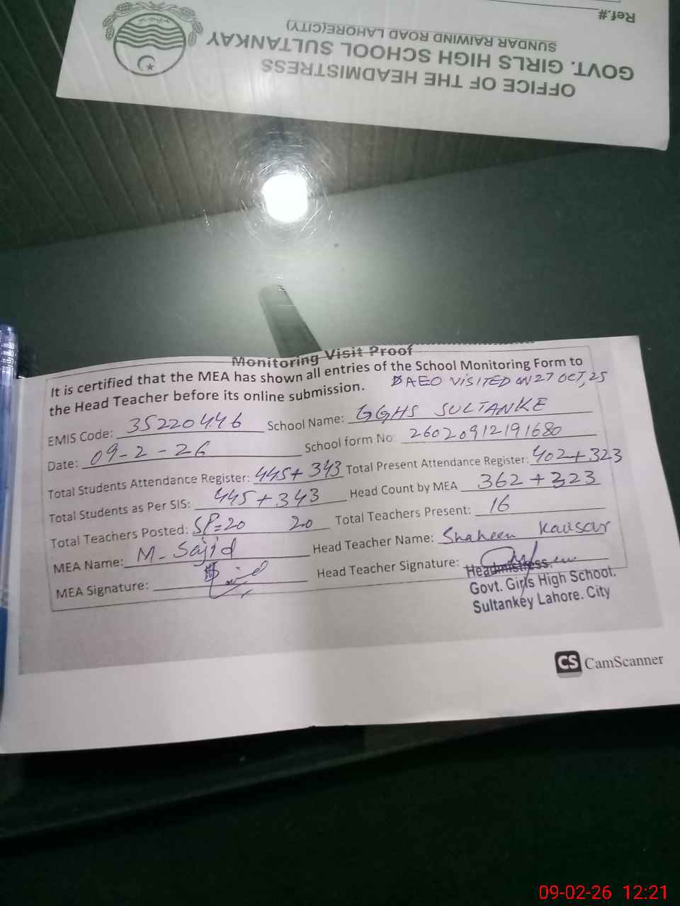 | Attendance Register | Head Teacher | MEA with School | Visit Proof |