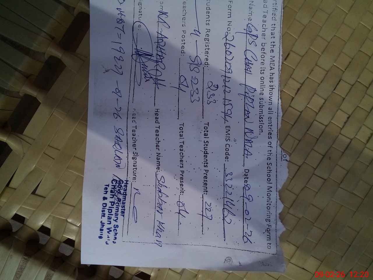 | EMIS Code: 33221462 | Name of School: GPS CHAH PIPLAN WALA | |||