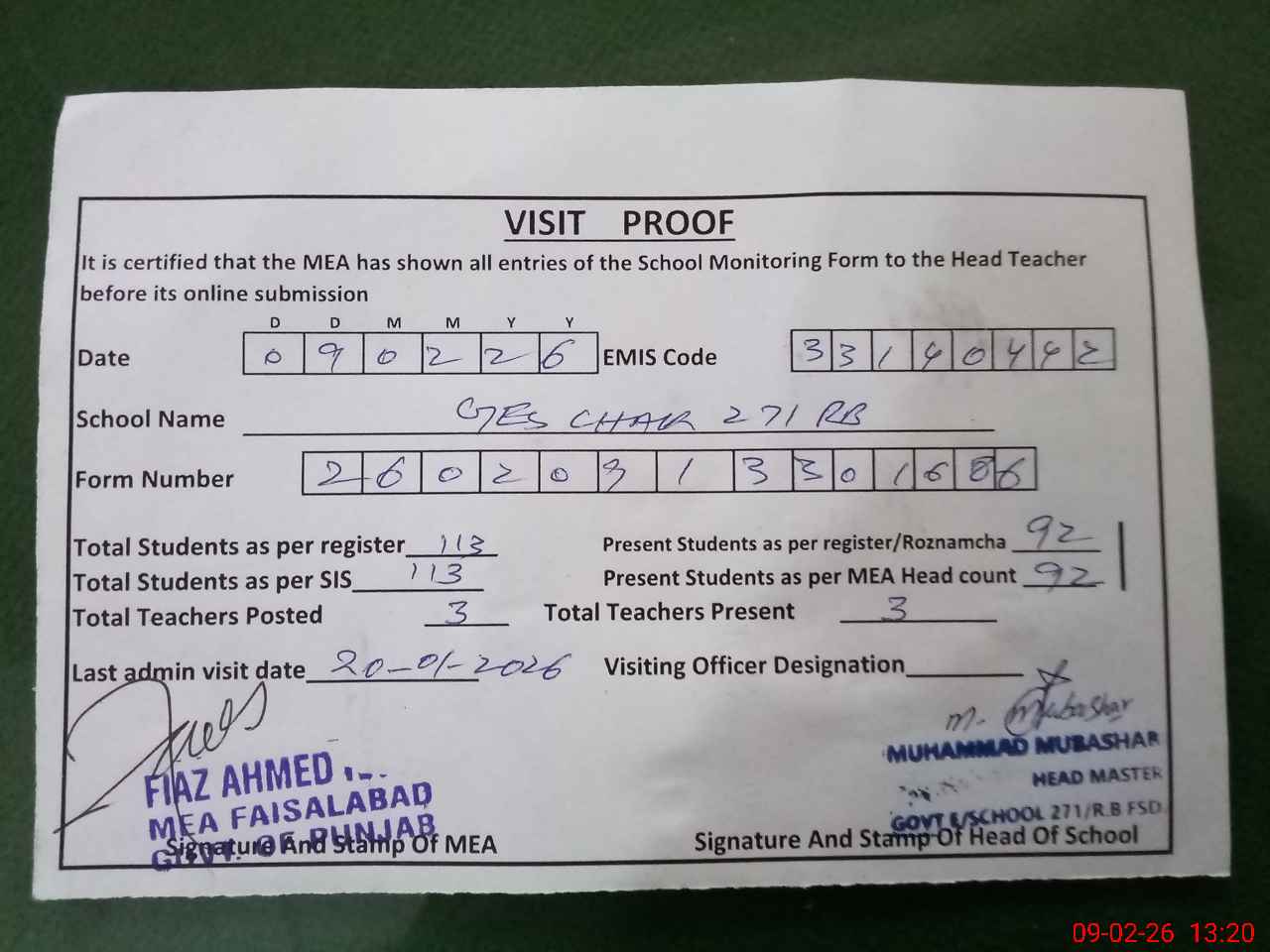 | Attendance Register | Head Teacher | MEA with School | Visit Proof |