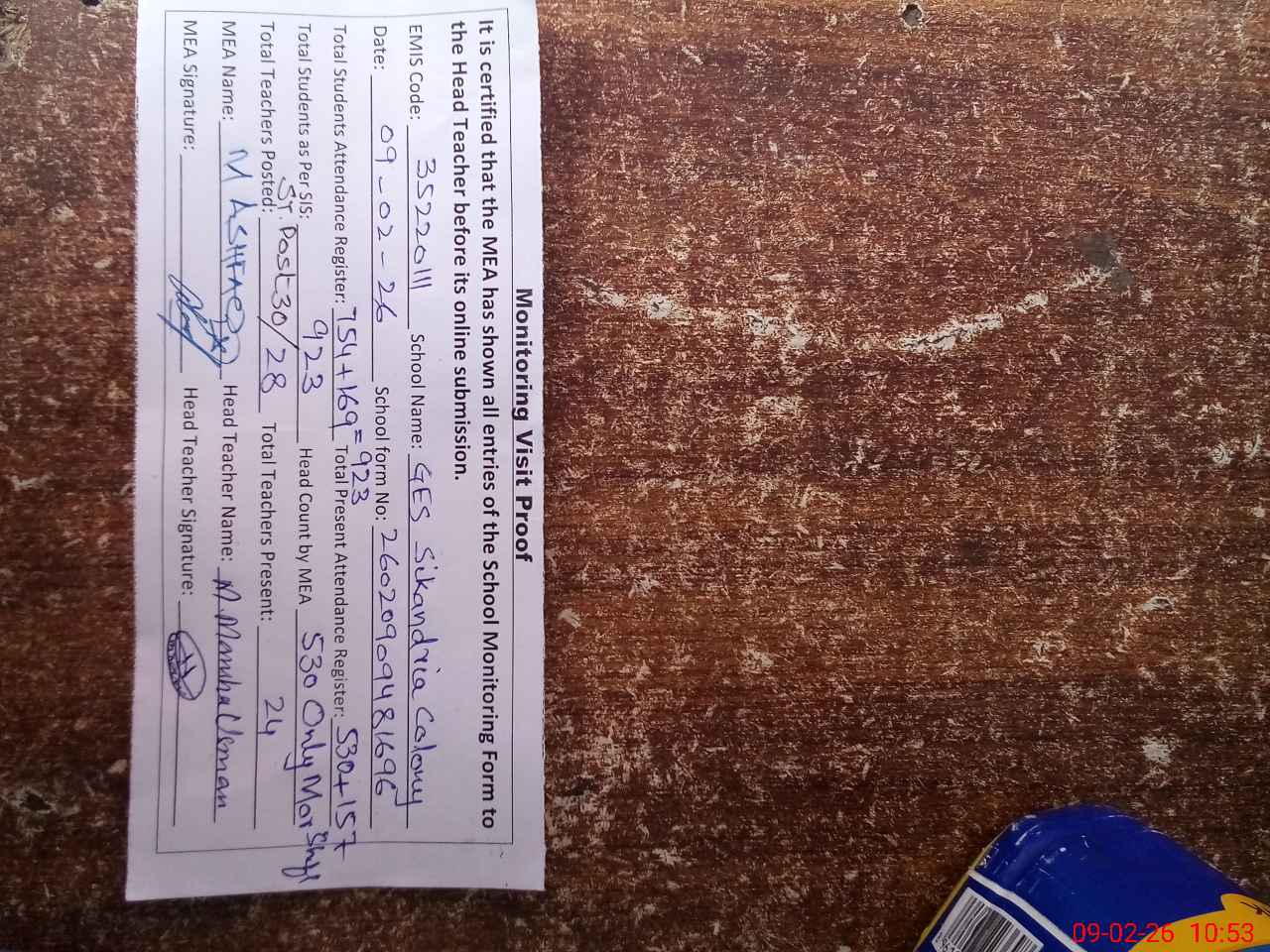| Attendance Register | Head Teacher | MEA with School | Visit Proof |