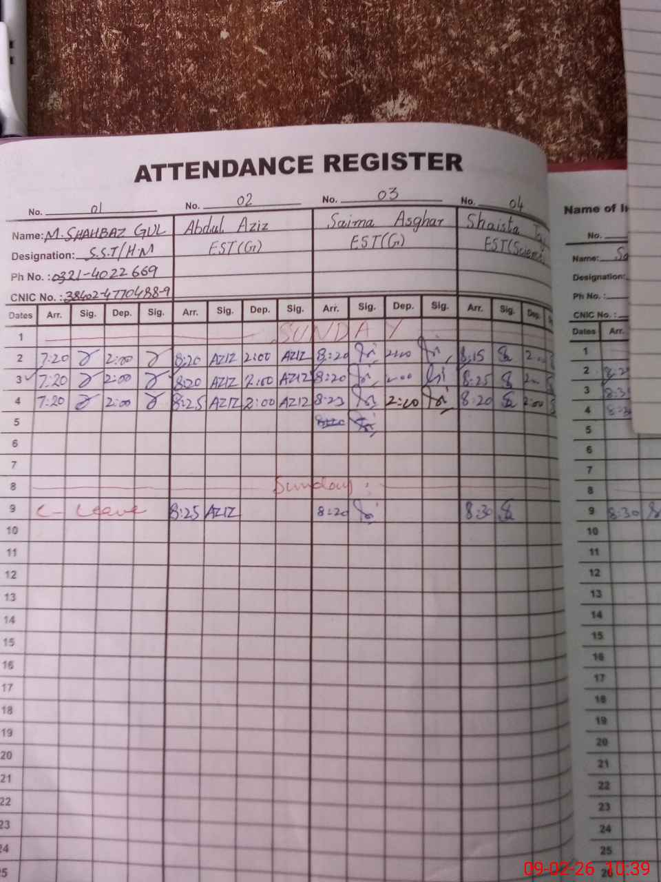 | CNIC | Full Name | Designation | R/C | Absence During Last Calender Month |