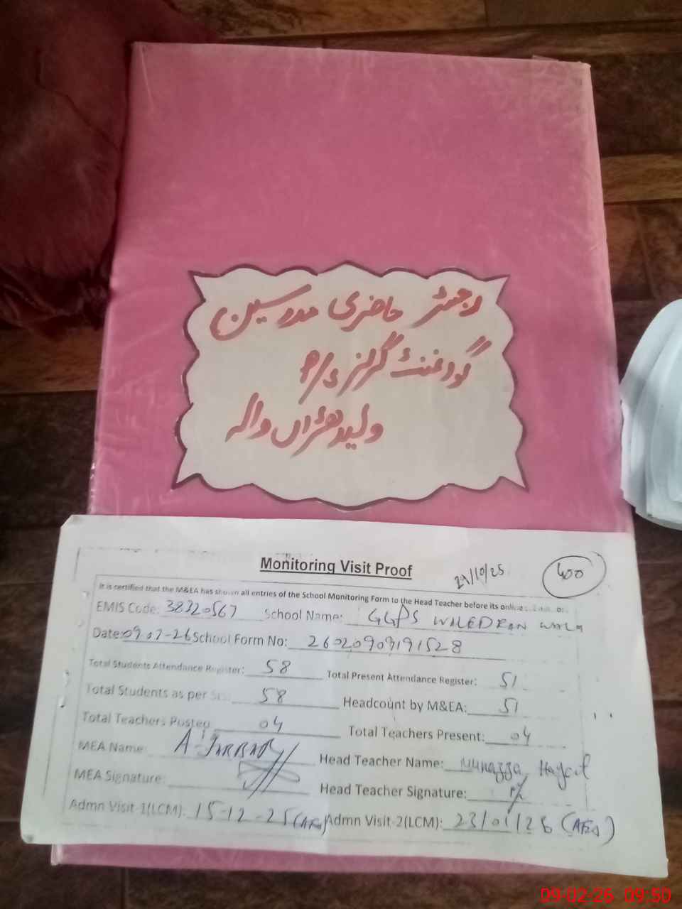 | Attendance Register | Head Teacher | MEA with School | Visit Proof |