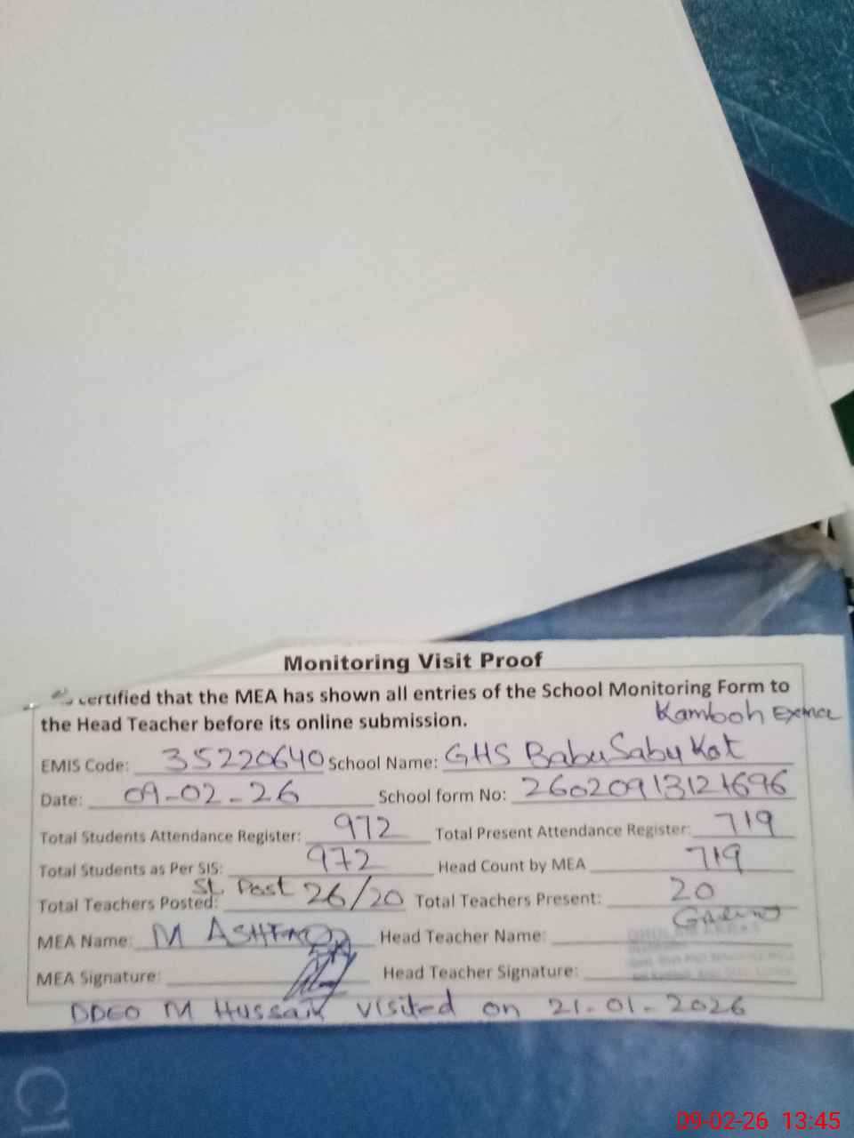 | EMIS Code: 35220640 | Name of School: GHS BABU SABU KOT KAMBOH (EX-MCL) | |||