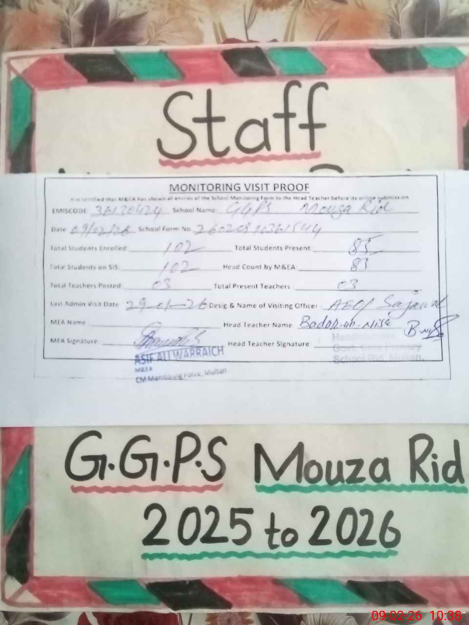 | Attendance Register | Head Teacher | MEA with School | Visit Proof |