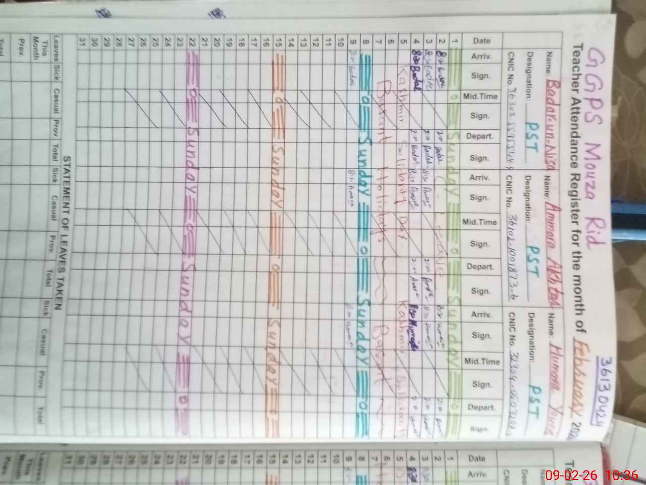 | CNIC | Full Name | Designation | R/C | Absence During Last Calender Month |