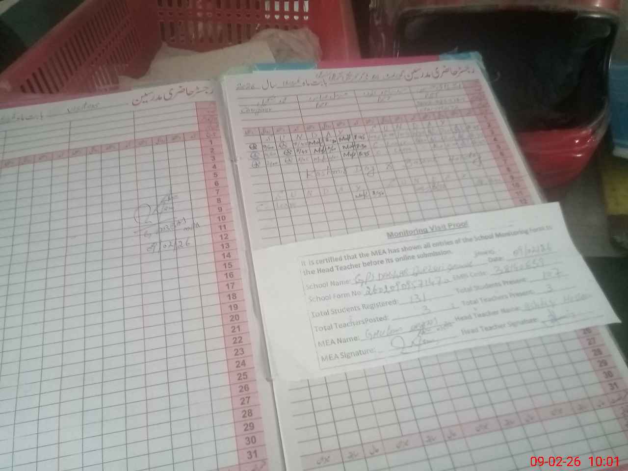| Attendance Register | Head Teacher | MEA with School | Visit Proof |