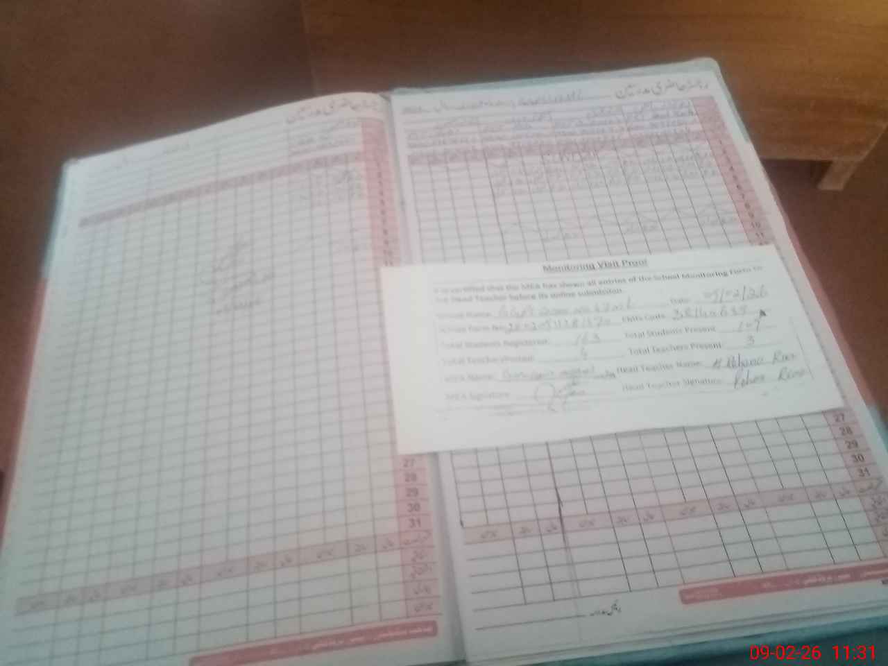 | Attendance Register | Head Teacher | MEA with School | Visit Proof |