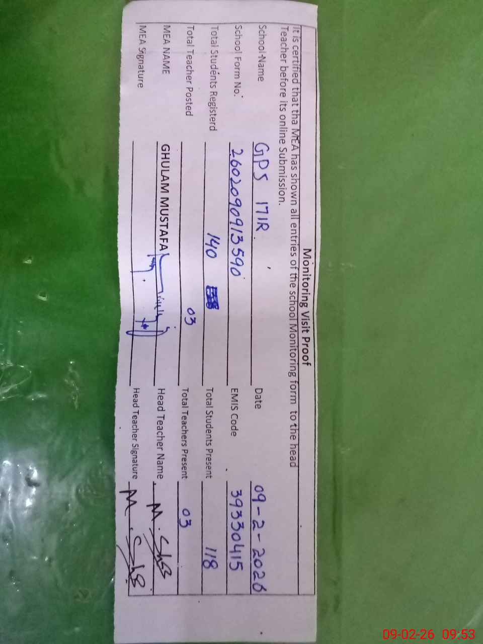 | Attendance Register | Head Teacher | MEA with School | Visit Proof |
