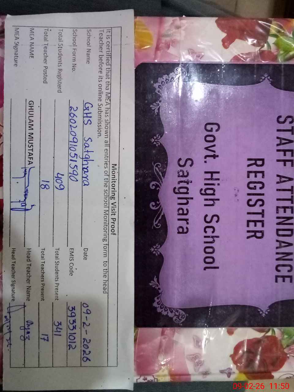 | Attendance Register | Head Teacher | MEA with School | Visit Proof |
