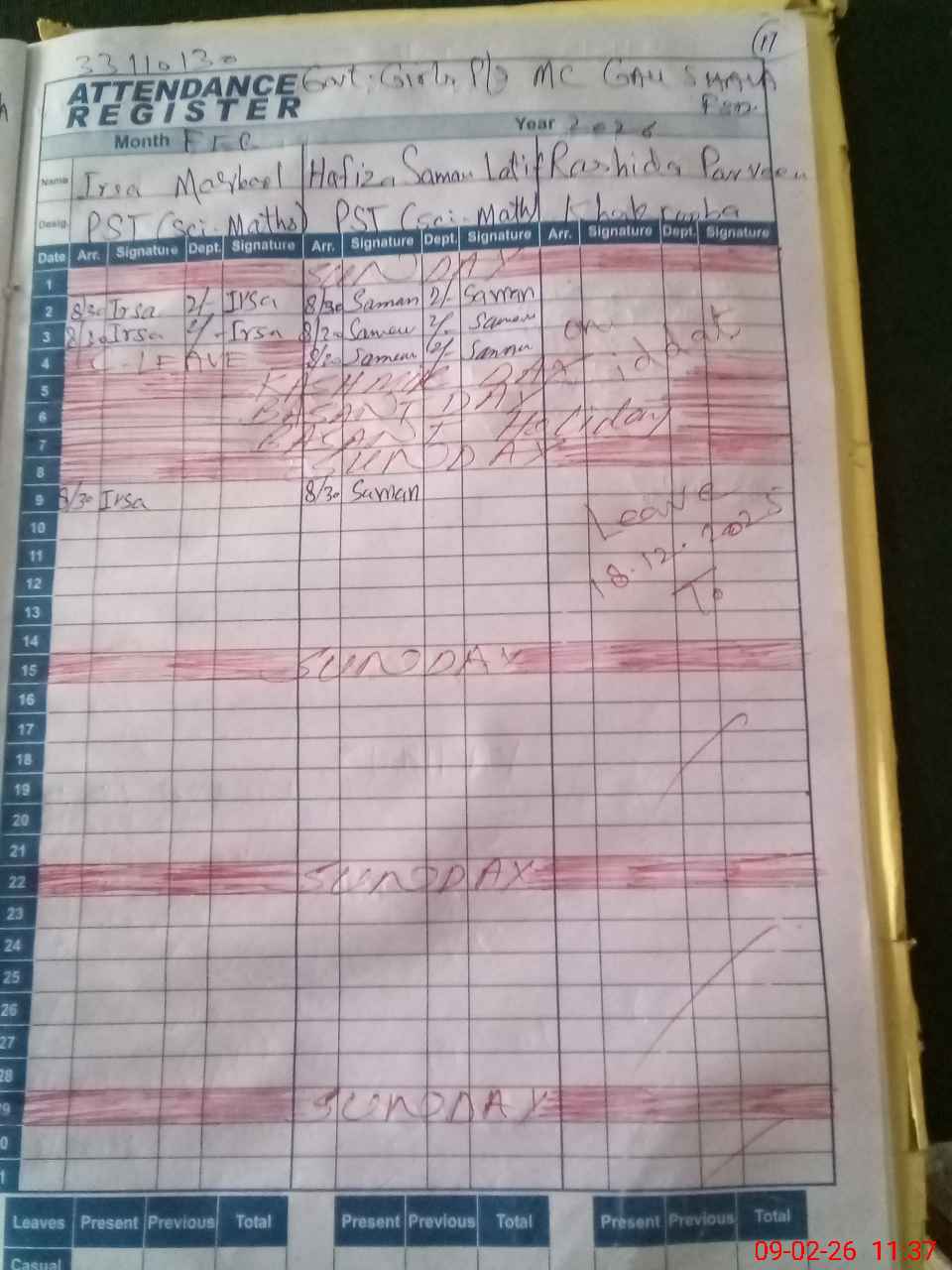 | No. of Students Present - Female | 0 | 7 | 7 | 14 | 13 | 15 | 12 | 77 | ||||||||