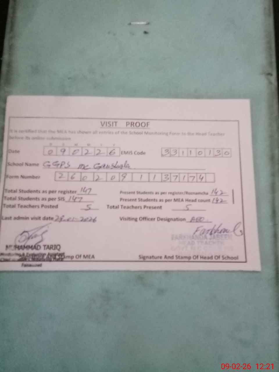 | Attendance Register | Head Teacher | MEA with School | Visit Proof |