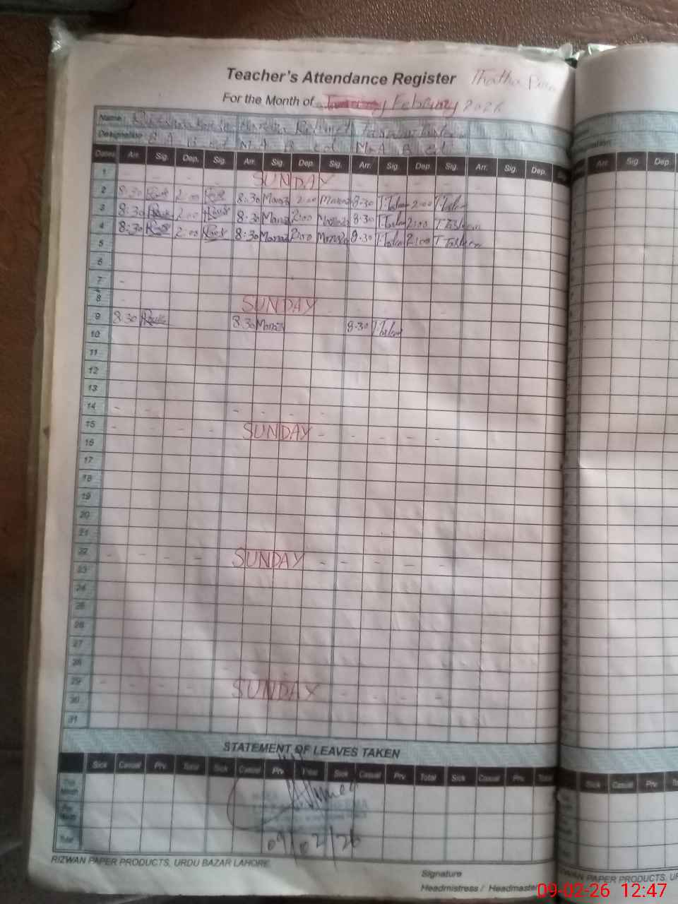 | Remarks (Use Separate Page if Required): Teacher Munaza Rehmat was absent from school but her prsence was marked in attendance register | |||||