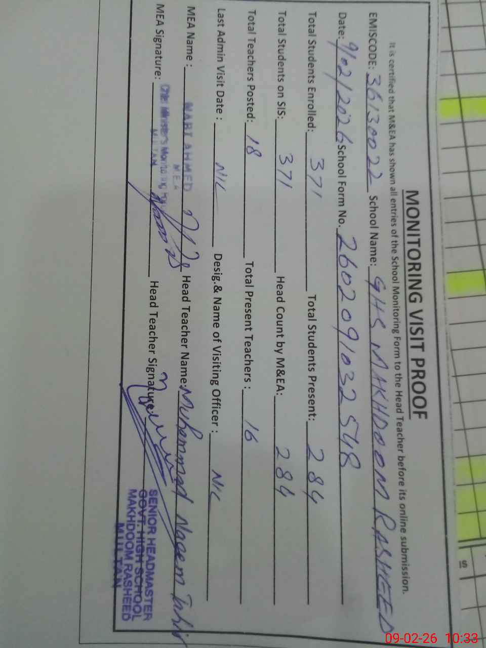 | EMIS Code: 36130022 | Name of School: GHS MAKHDOOM RASHEED | |||
