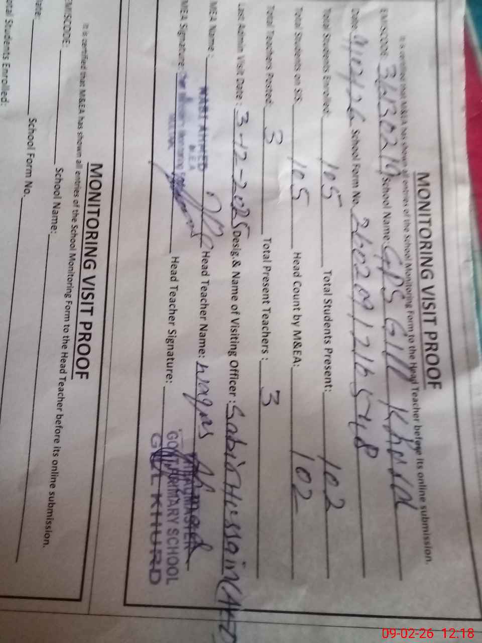 | Attendance Register | Head Teacher | MEA with School | Visit Proof |