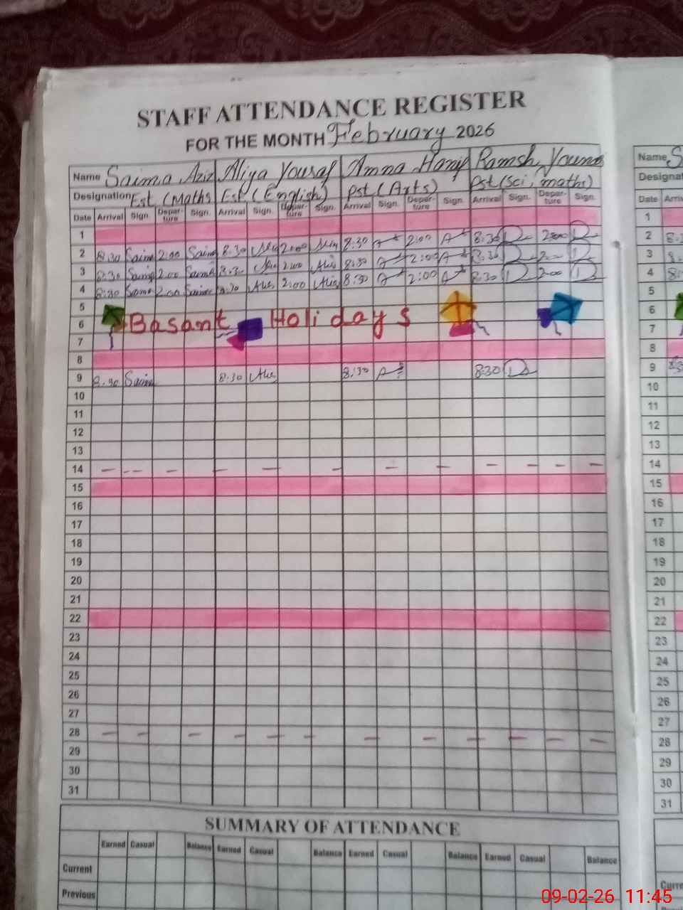 | No. of Students Present - Female | 0 | 65 | 21 | 28 | 28 | 27 | 24 | 26 | 30 | 20 | 301 | |||||