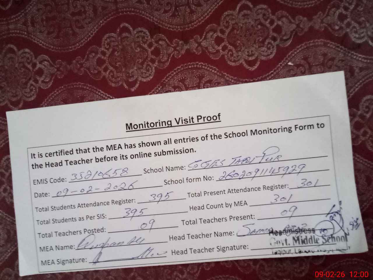 | Attendance Register | Head Teacher | MEA with School | Visit Proof |