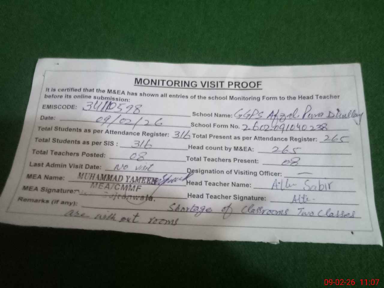 | EMIS Code: 34110598 | Name of School: GGPS AFZAL PURA DHULLAY | |||