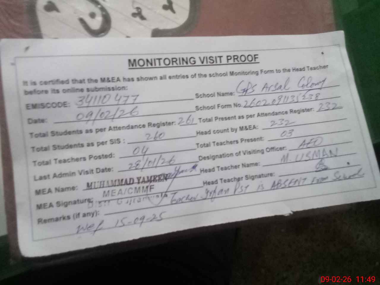 | Attendance Register | Head Teacher | MEA with School | Visit Proof |
