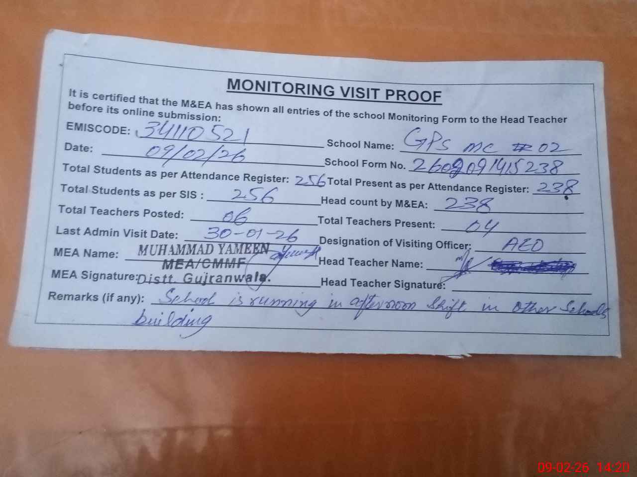 | Attendance Register | Head Teacher | MEA with School | Visit Proof |