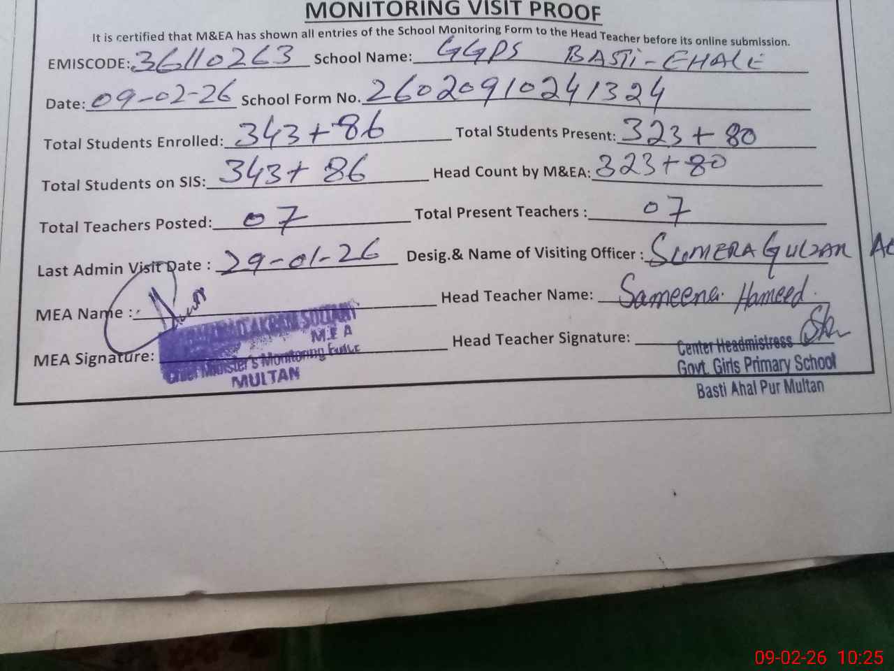 | EMIS Code: 36110263 | Name of School: GGPS BASTI AHIL PUR MULTAN | |||