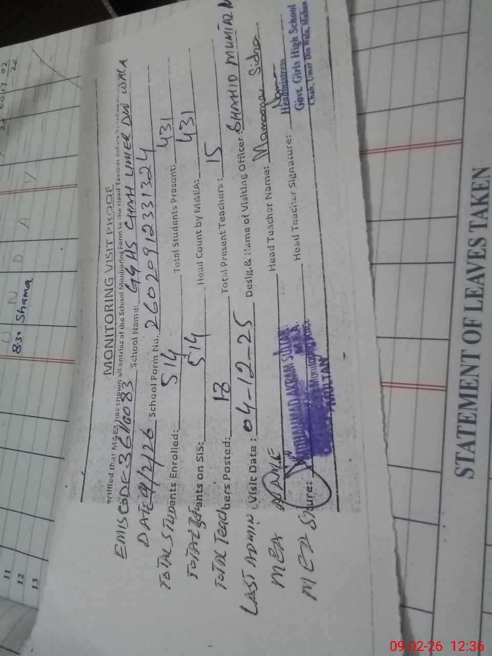| EMIS Code: 36110083 | Name of School: GGHS CHAH UMER DIN WALA | |||