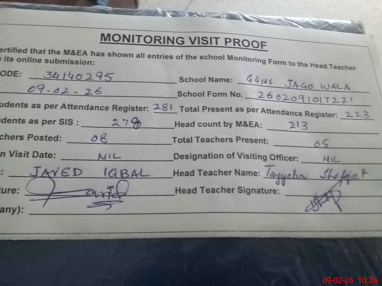 | Monitoring Date: 09-02-2026 | Start Time: 09-02-2026 09:29 AM | End Time: 09-02-2026 10:26 AM | Name of MEA: S-**** Iq**** Sh**** | |