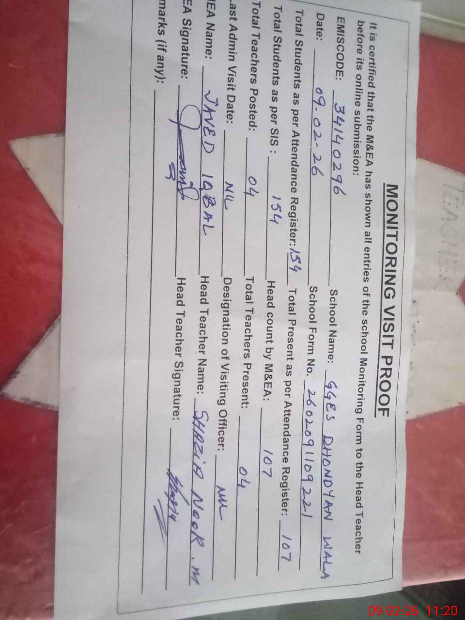 | Attendance Register | Head Teacher | MEA with School | Visit Proof |