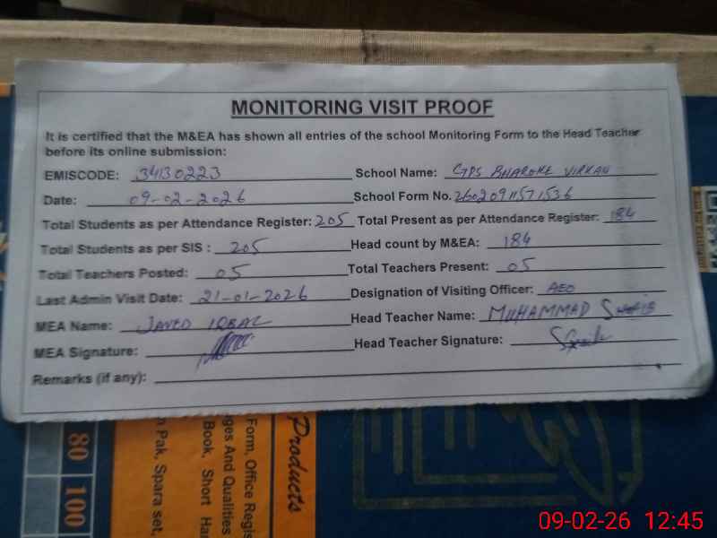 | EMIS Code: 34130223 | Name of School: GPS BHAROKE VIRKAN | |||