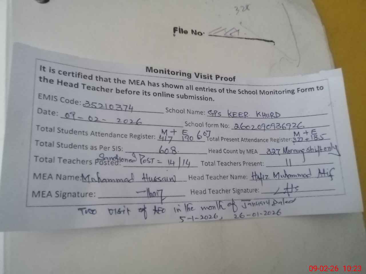 | Attendance Register | Head Teacher | MEA with School | Visit Proof |
