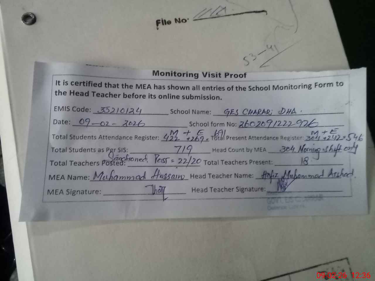 | Attendance Register | Head Teacher | MEA with School | Visit Proof |