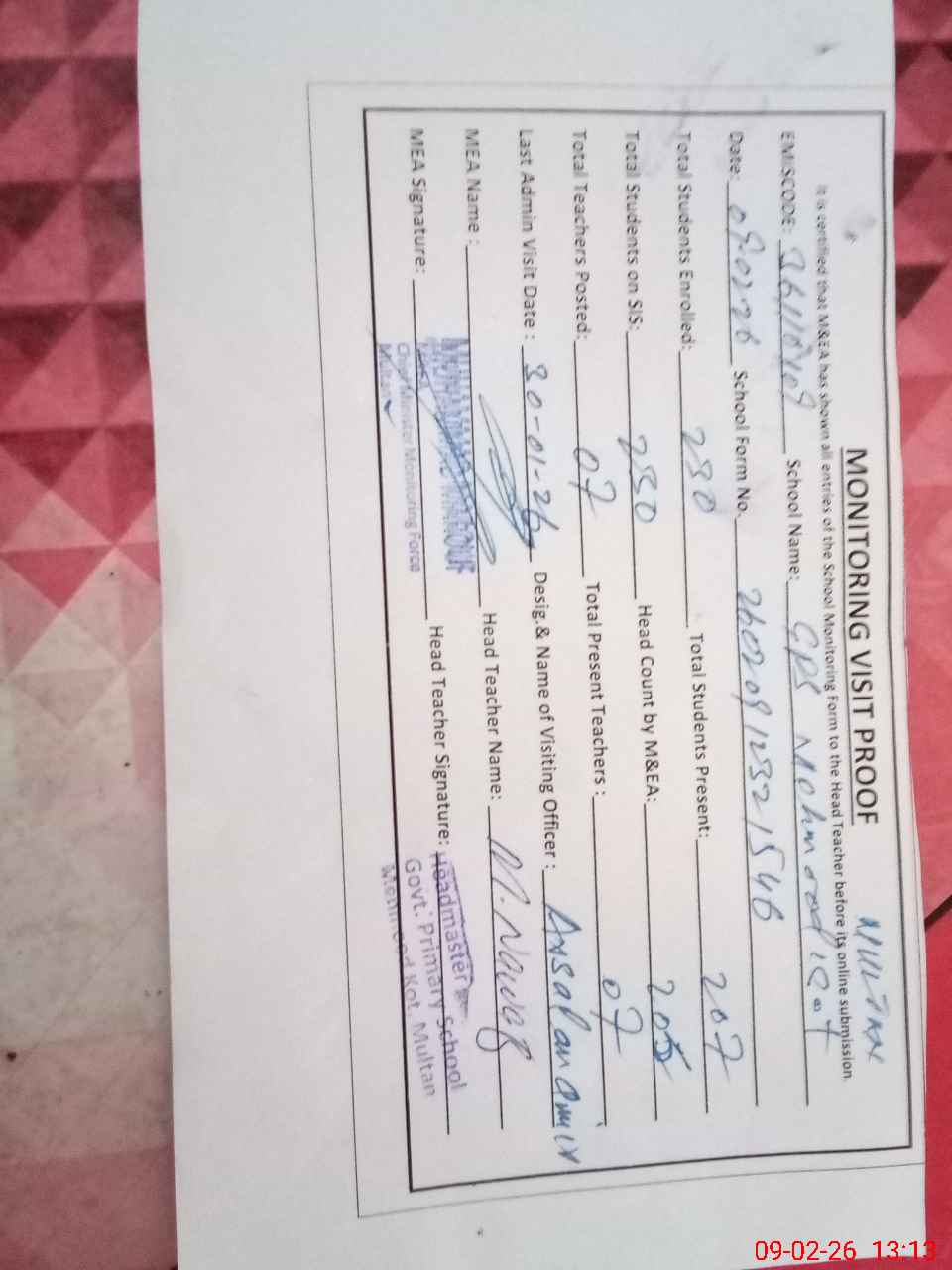 | EMIS Code: 36110109 | Name of School: GPS MEHMOOD KOT BOSAN ROAD MULTAN | |||