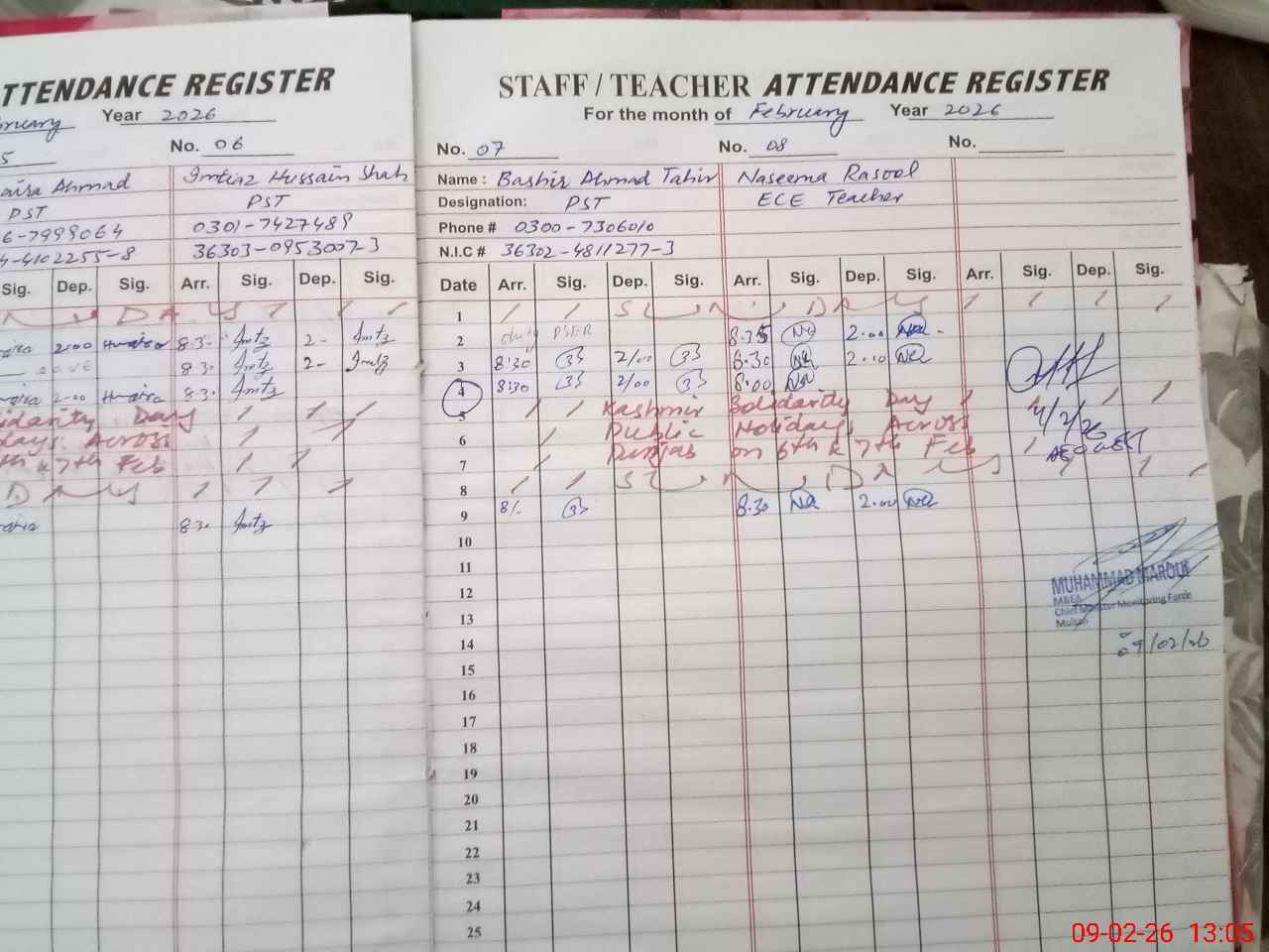 | Remarks (Use Separate Page if Required): Afternoon rosenamcha not maintained poor cleaning dusty atmosphere of class rooms Cash book record not maintained after June 2025 FTF record not provided in after noon shift private teacher Fatima kalsoom was absent on last working day 04th Feb 26 | |||||