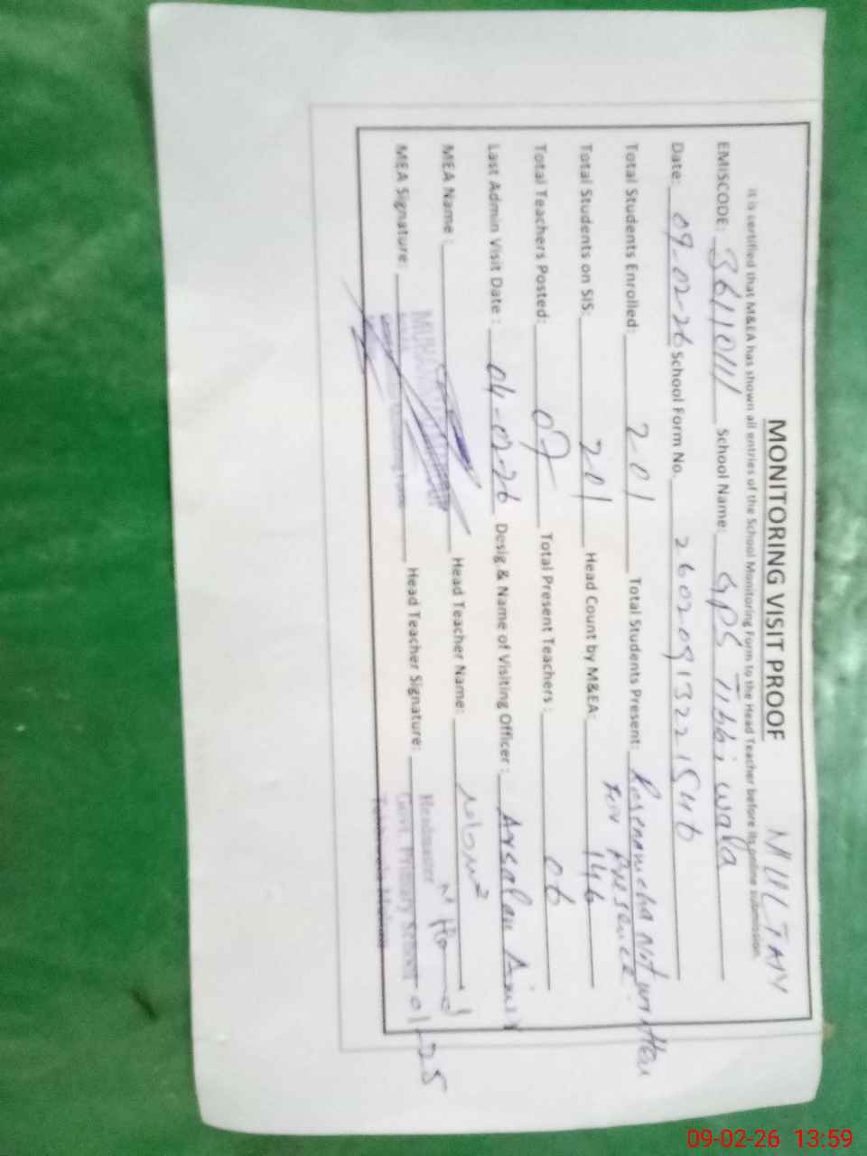 | Certified that this School was Inspected by the Undersigned MEA/DMO Today and the Information Stated Above is as Per Record. | |||||