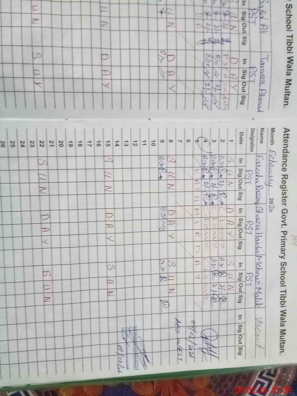 | Remarks (Use Separate Page if Required): PST mehnaz Malik not available in the school marked as absent CIV Muhammad Zain not available in the school marked as absent 04th Feb 26 rosnamcha not maintained 09th 26 rosenamcha students attendance not mentioned Wash basin blocked and dirty soap not placed | |||||
