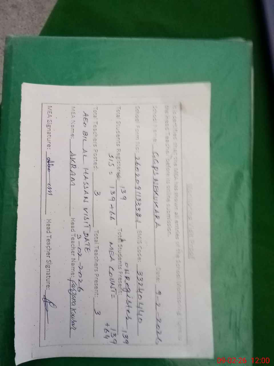 | Attendance Register | Head Teacher | MEA with School | Visit Proof |