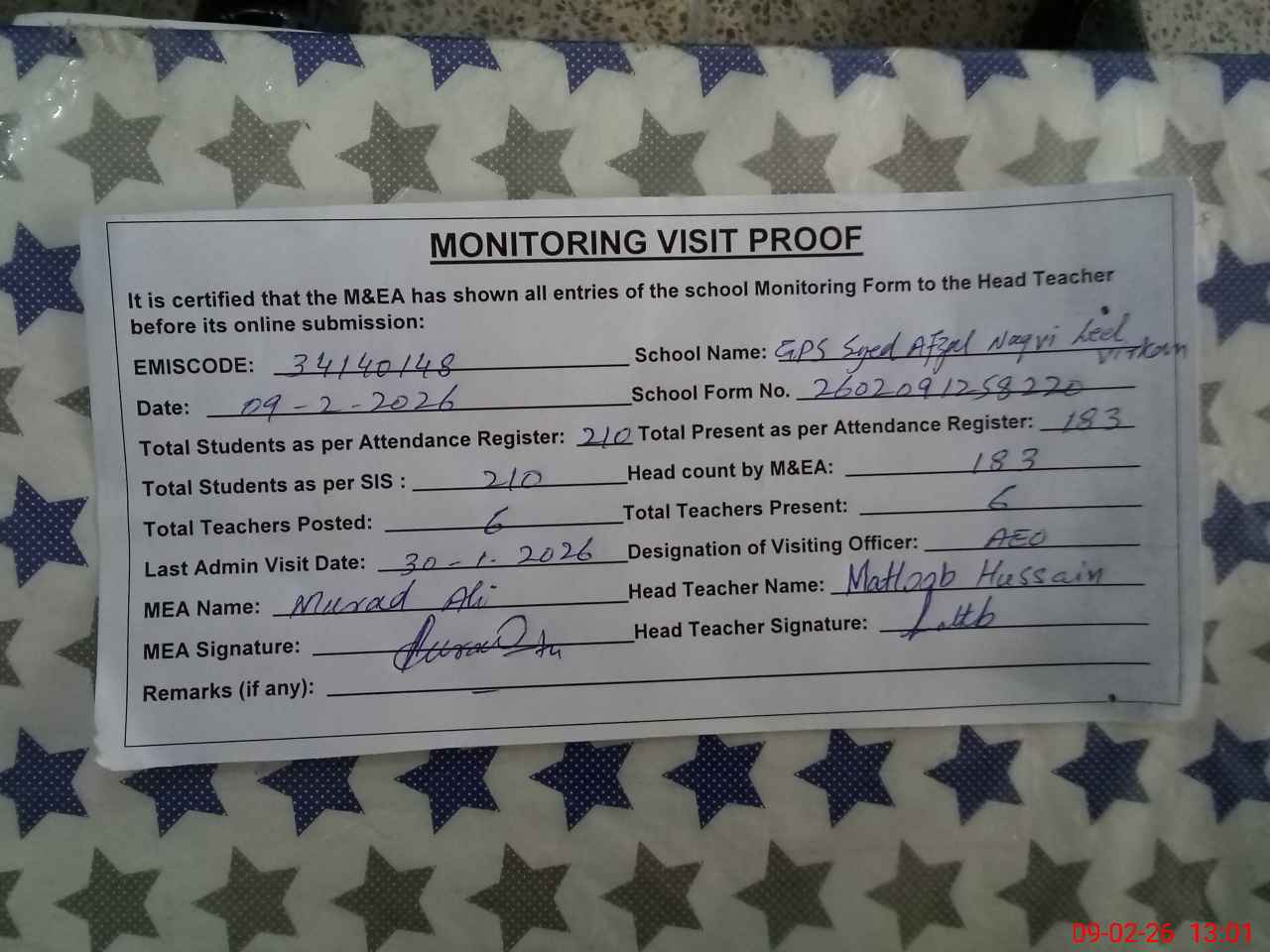 | Attendance Register | Head Teacher | MEA with School | Visit Proof |