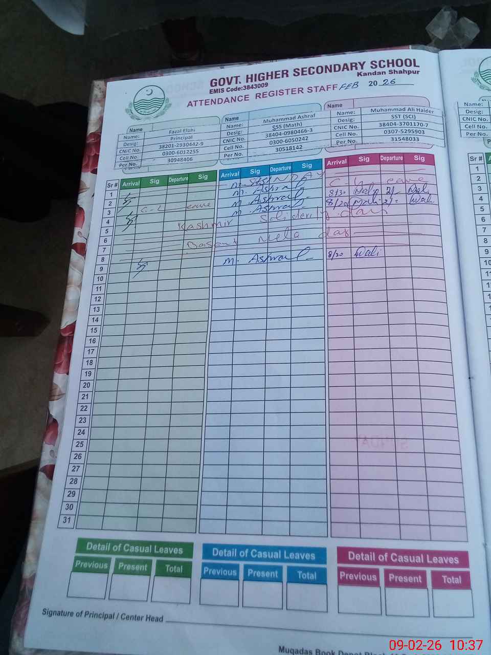 | CNIC | Full Name | Designation | R/C | Absence during last cal. month |