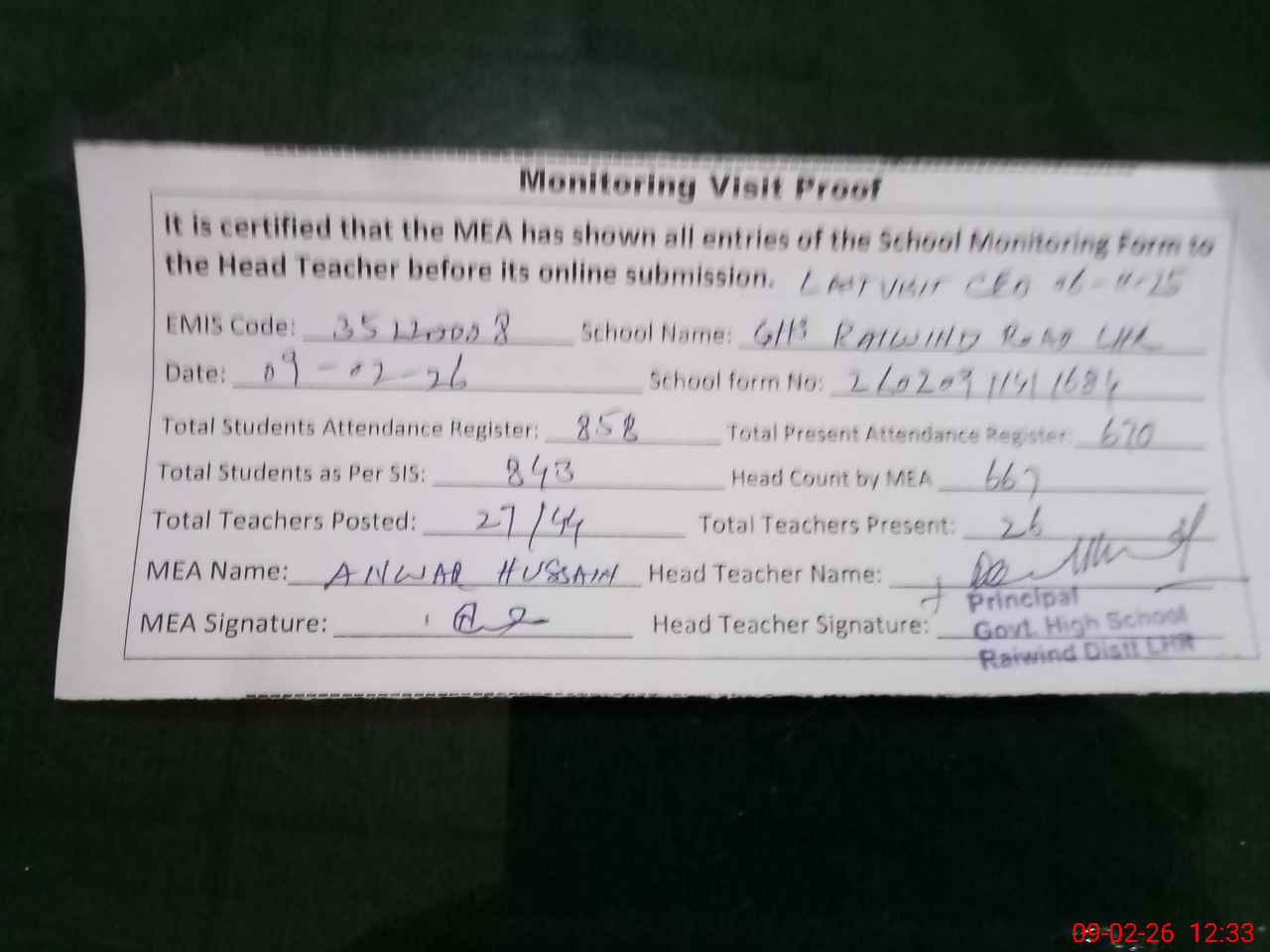 | Attendance Register | Head Teacher | MEA with School | Visit Proof |