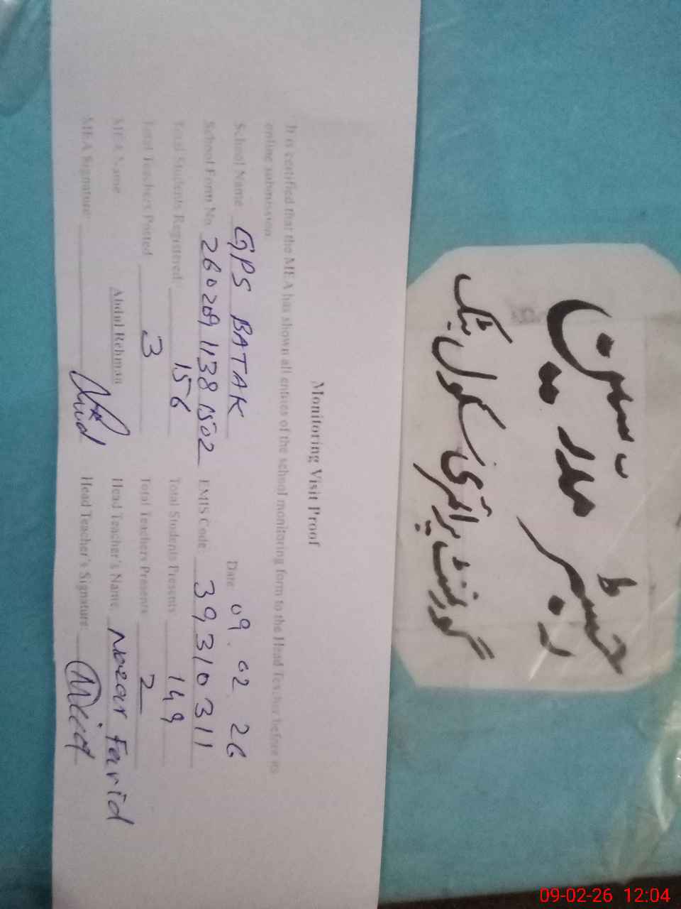 | Attendance Register | Head Teacher | MEA with School | Visit Proof |