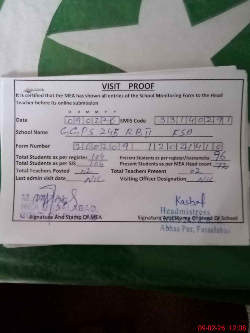 | EMIS Code: 33140291 | Name of School: GGPS CHAK 245 RB ABBAS PUR | |||