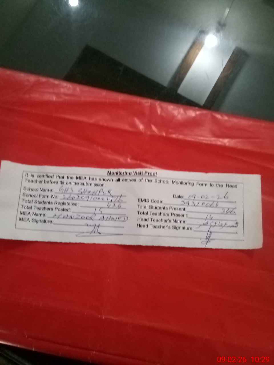 | Attendance Register | Head Teacher | MEA with School | Visit Proof |